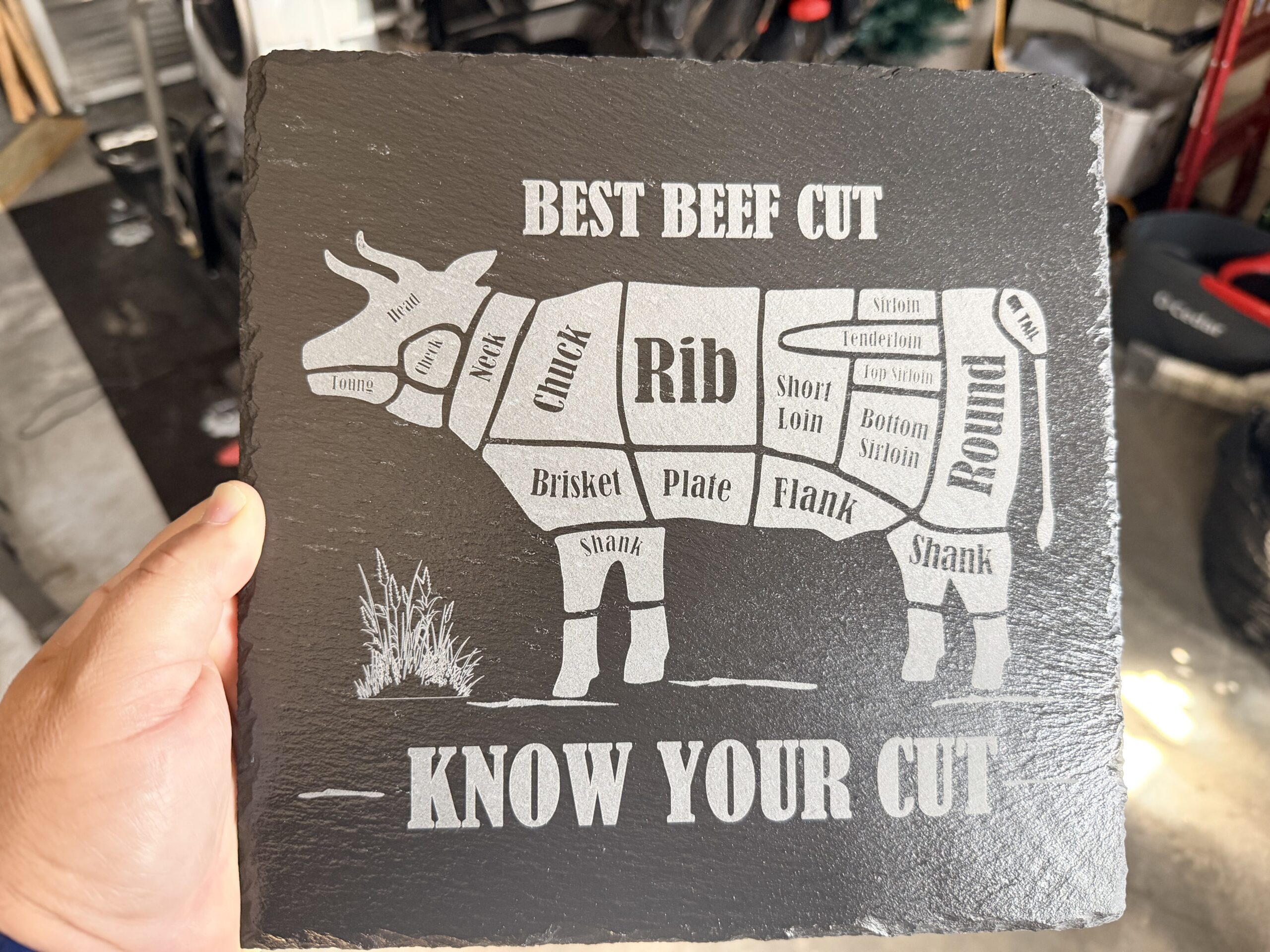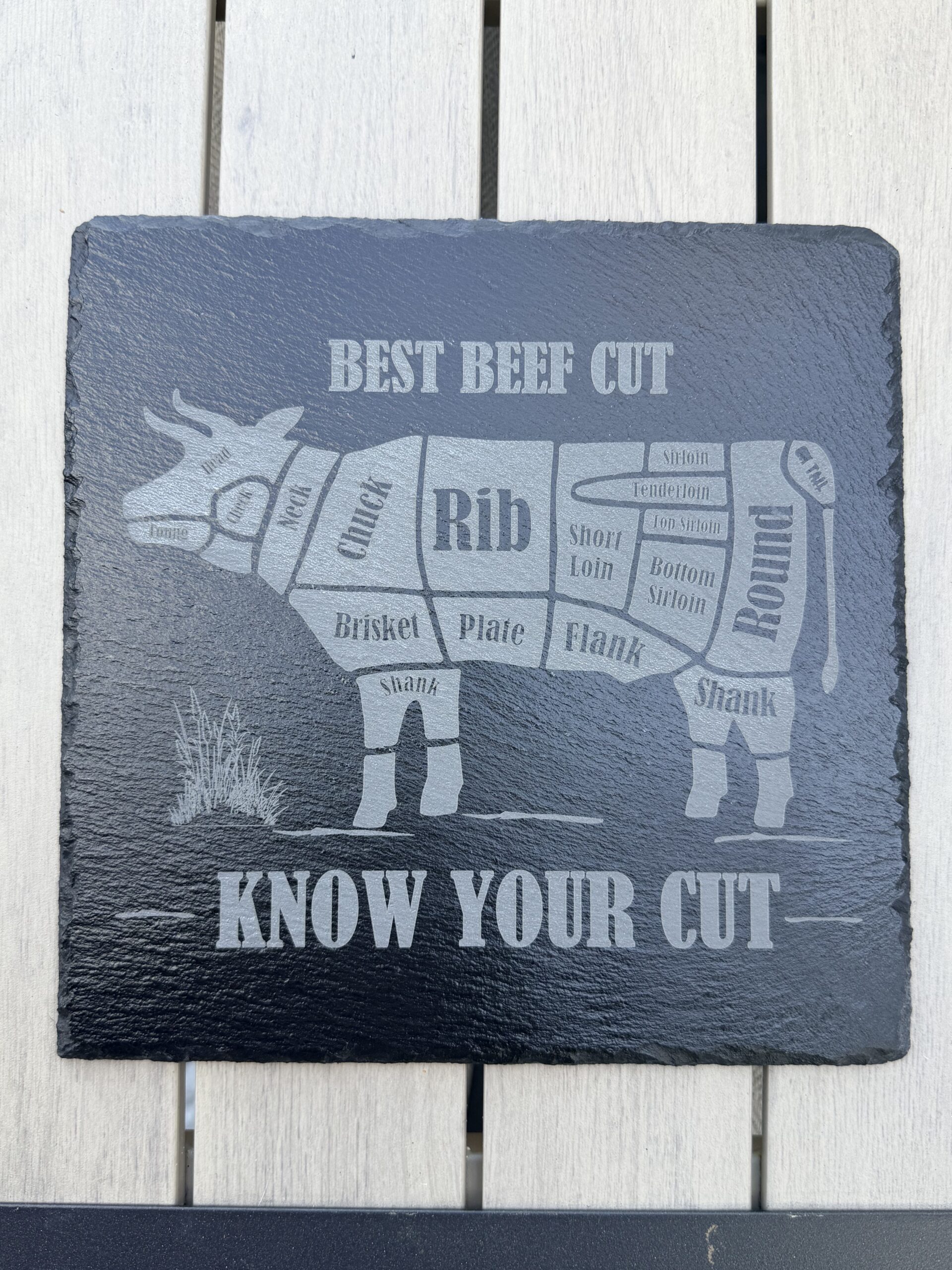 Crafted from premium 9.8″ x 9.8″ natural slate, each piece features a high-contrast laser engraving that highlights the different cuts of beef, making it both decorative and educational.